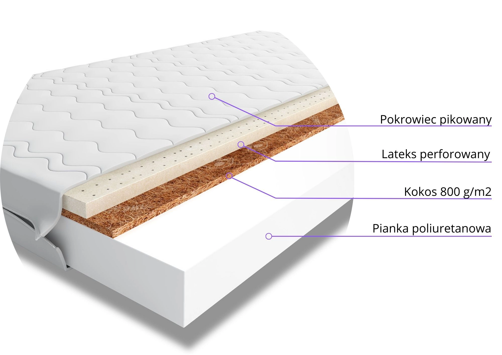 - Komfort i wsparcie: Idealne dopasowanie do kształtu ciała dzięki kombinacji pianki poliuretanowej, lateksu i warstwy kokosu.