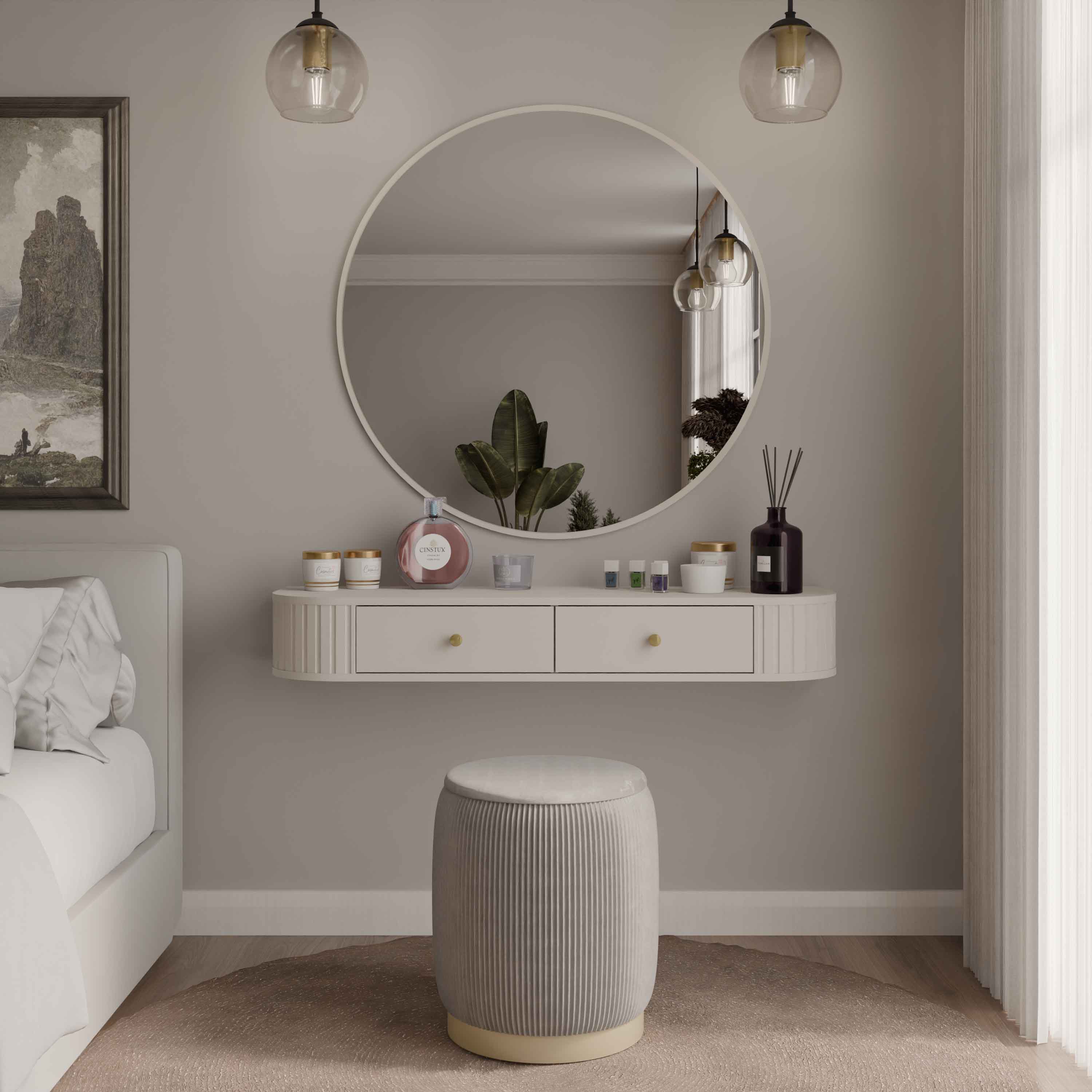 Okrągłe lustro doskonale uzupełnia całą kolekcję Flana, wprowadzając do wnętrza harmonię i lekkość. Dzięki dużej średnicy 100 cm stanowi nie tylko praktyczny element wyposażenia, ale również elegancką dekorację. W wersji beż piaskowy idealnie komponuje się z pozostałymi meblami kolekcji, tworząc spójny i stylowy zestaw.