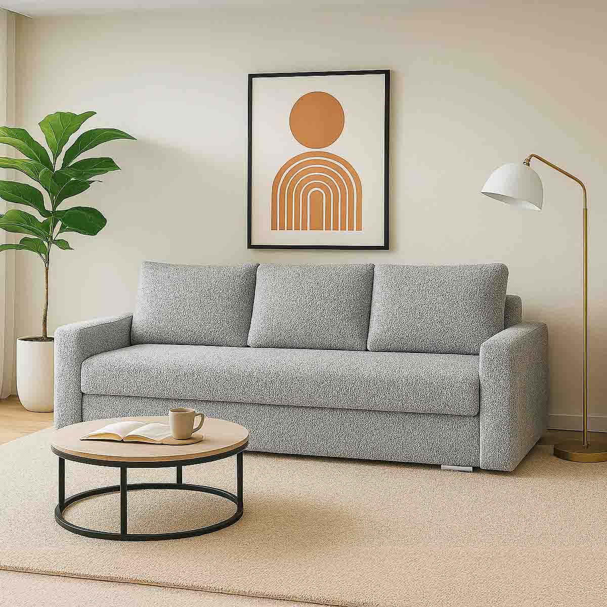 Szukasz wygodnej i nowoczesnej kanapy? Silver 3 to idealne połączenie stylu i funkcjonalności! Wygodna sofa z funkcją spania, pojemnikiem na pościel i modnym wykończeniem z miękkiej tkaniny boucle – idealna do codziennego użytku i relaksu. Wyposażona w sprężyny bonellowe na całej powierzchni spania, gwarantuje dobry sen każdej nocy. Innowacyjny mechanizm rozkładania pozwala w mgnieniu oka przekształcić sofę w przestronne łóżko dla dwóch osób.