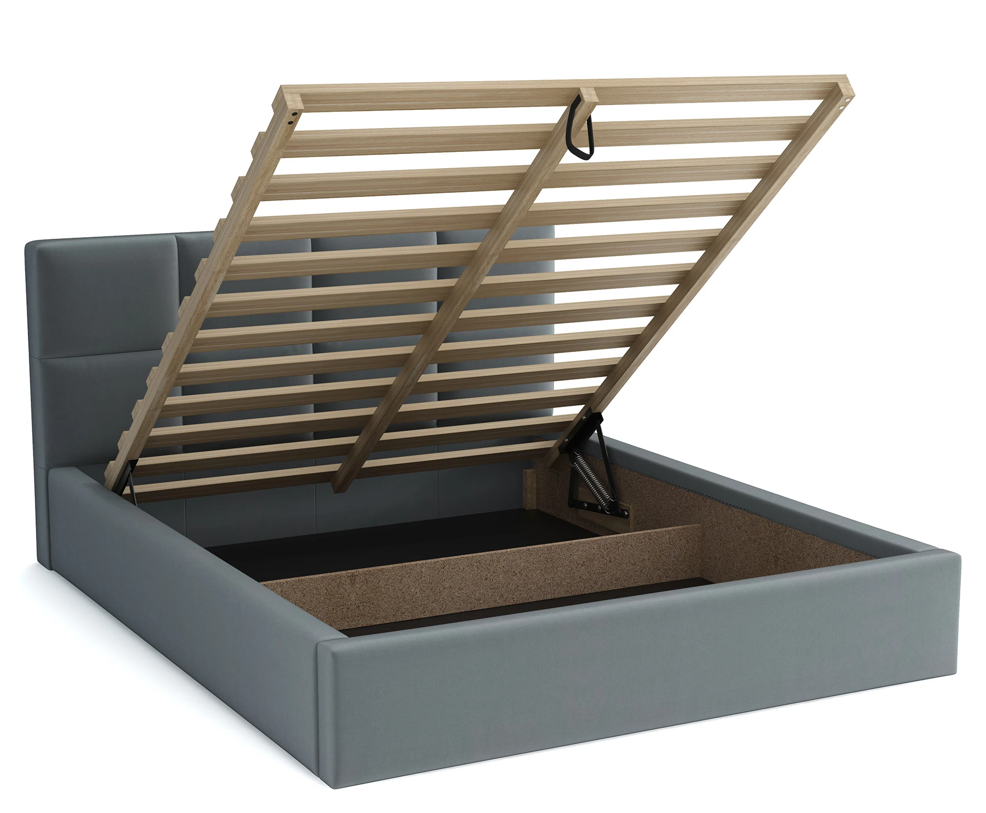 Jest to ważny element mebla, który ma służyć na lata. Szkielet został wykonany z płyty wiórowej wysokiej gęstości, wzmocnionej elementami wykonanymi z litego drewna. Dzięki temu łózko jest niezwykle wytrzymałe i stabilne. Mocna drewniana, unoszona rama wyposażona w dodatkową podporę pozwala na przenoszenie ciężarów do 400 kg.