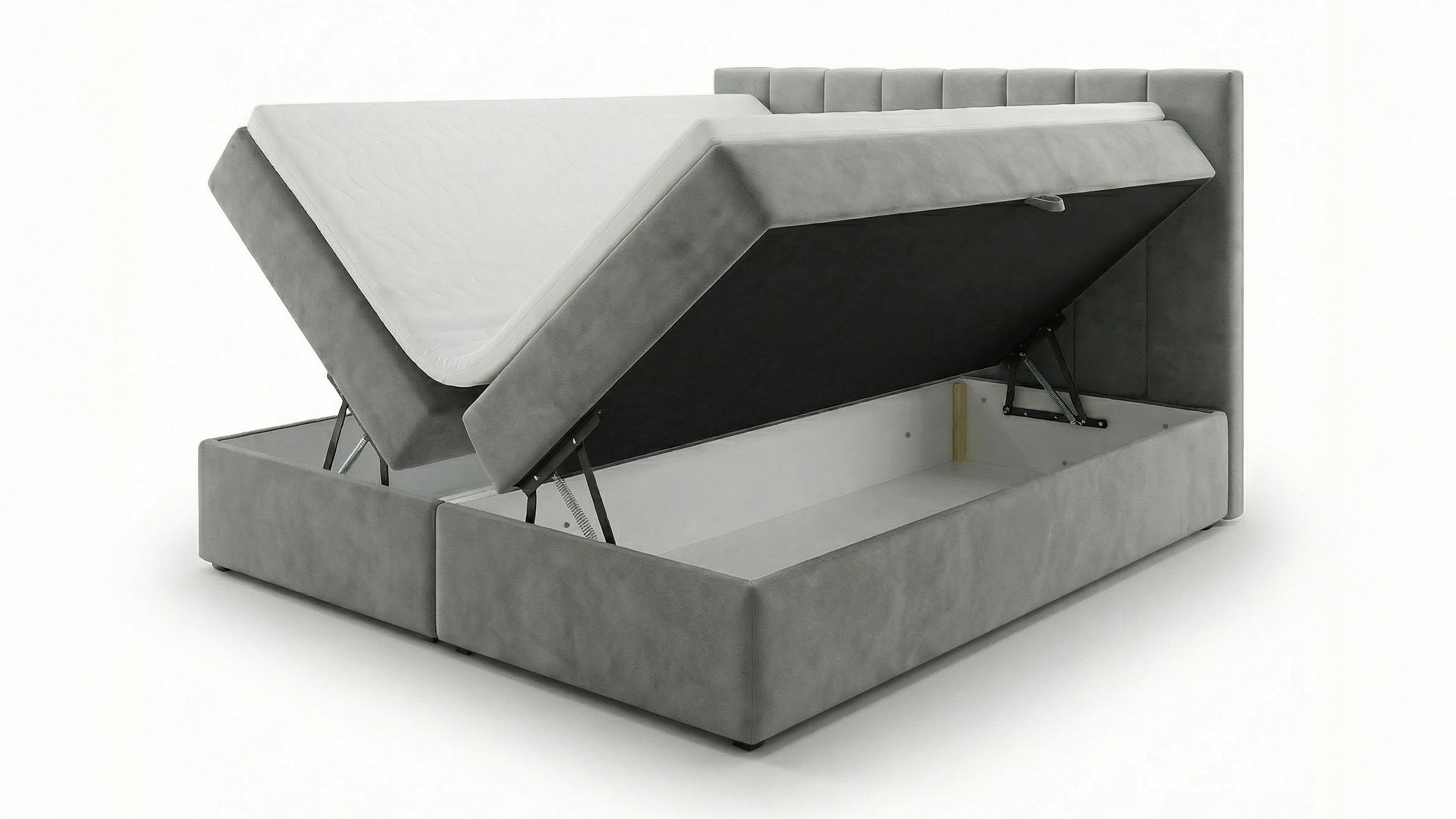 Dwa pojemne pojemniki umożliwiają wygodne przechowywanie kołder, poduszek i tekstyliów w zasięgu ręki, a zastosowane automaty utrzymują siedzisko w górnej pozycji po otwarciu, zapewniając bezpieczny i swobodny dostęp do schowków bez ryzyka nagłego opadnięcia i uderzenia. To rozwiązanie, które zwiększa komfort, bezpieczeństwo i funkcjonalność łóżka, szczególnie istotne w nowoczesnych mieszkaniach.