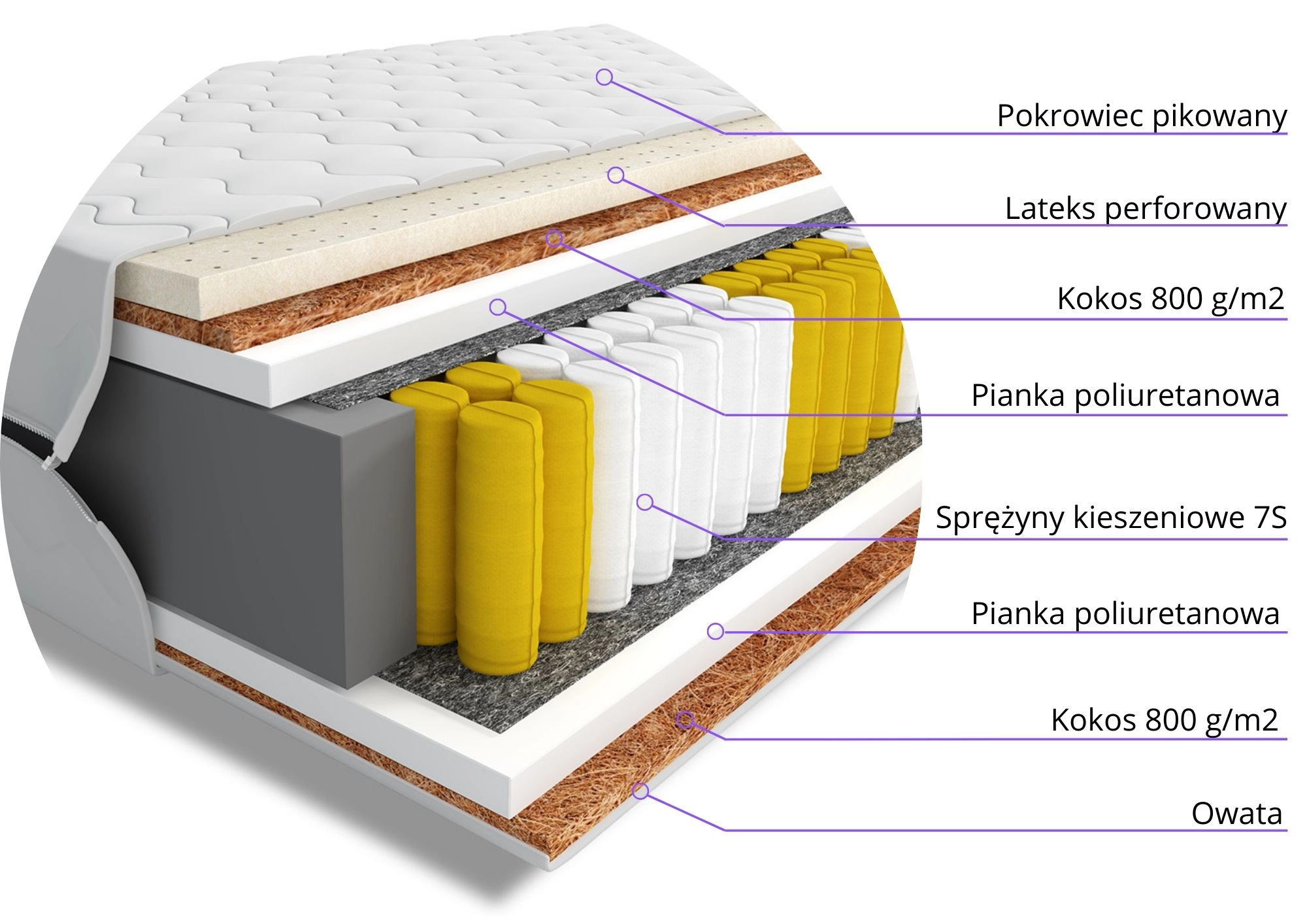 Główna warstwa sprężyn kieszeniowych o wysokości 18 cm oferuje 7 stref twardości, które precyzyjnie podpierają różne części ciała. Każda sprężyna pracuje niezależnie, co minimalizuje przenoszenie ruchów i zapewnia spokojny sen. Dzięki podwójnie hartowanemu drutowi w sprężynach, materac jest wyjątkowo trwały i odporny na odkształcenia.