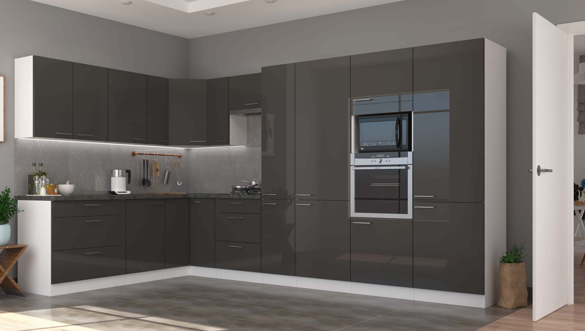 Praktyczna wysoka szafka kuchenna stojąca z funkcją cichego domyku. Szafka z kolekcji mebli kuchennych LARA.