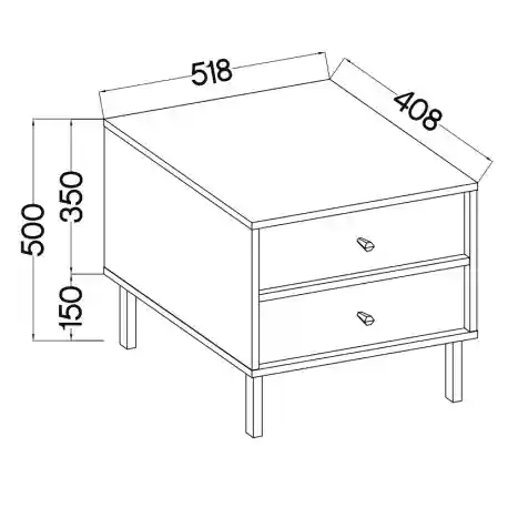 Praktyczny stolik nocny z dwoma pojemnymi szufladami, które zapewniają miejsce do przechowywania niezbędnych przedmiotów przy łóżku. Stolik osadzony jest na stabilnych, metalowych nogach w kolorze złotym, które dodają lekkości i elegancji całej konstrukcji. Metalowe gałki w kolorze złotym podkreślają nowoczesny styl mebla.