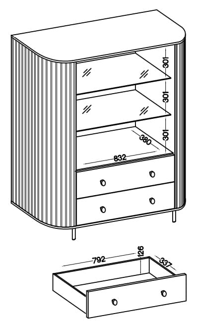Fronty wykonano z płyty laminowanej 16 mm wykończonej obrzeżem ABS. W drzwiach zastosowano szybę transparentną hartowaną 3 mm. Korpus łączy ryflowaną płytę MDF i płytę laminowaną, również w kolorze beż piaskowy. Półki wykonane są ze szkła 5 mm. Zastosowano zawiasy z cichym domykiem oraz prowadnice dolnego montażu z cichym domykiem w szufladach. Całość uzupełniają metalowe uchwyty i smukłe nogi w kolorze złotym. Tył wykonany z płyty HDF w kolorze beż piaskowy.