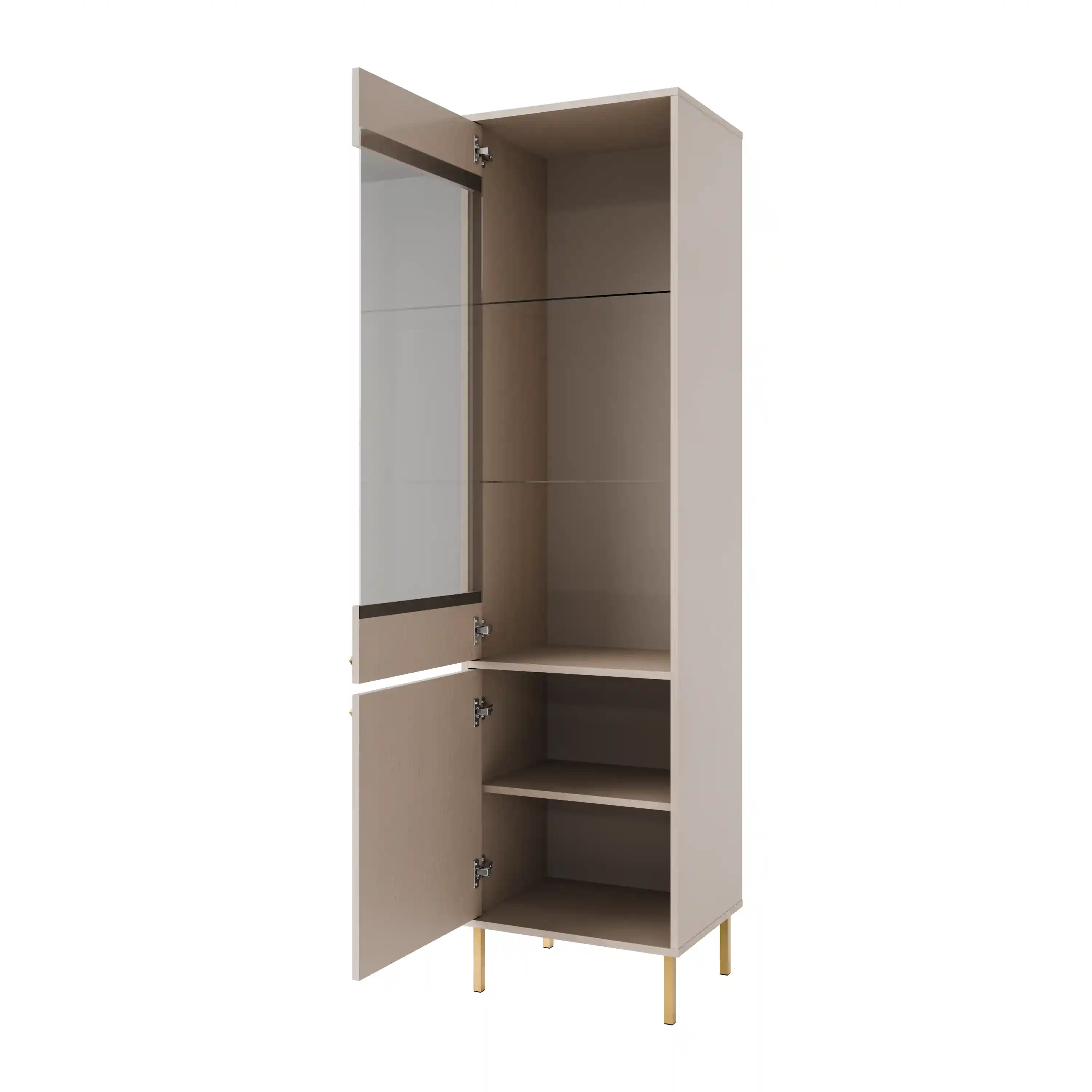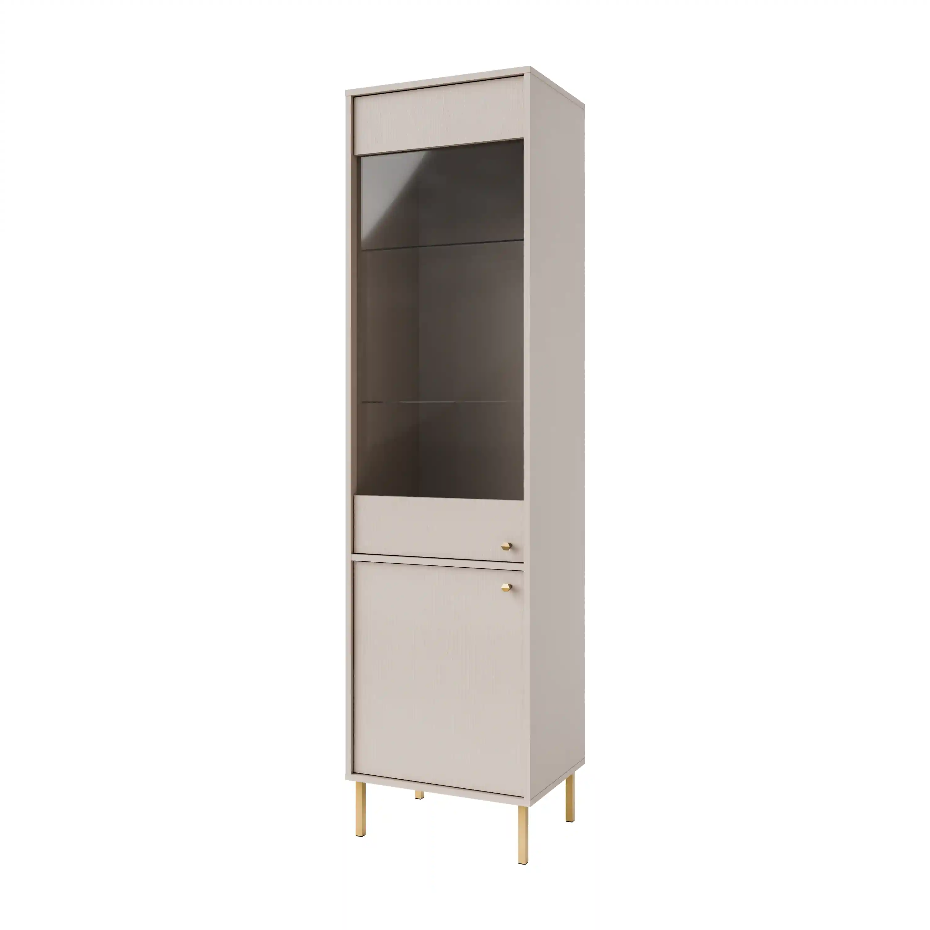 Witryna z kolekcji Sakai, wyposażona w dwoje drzwi - górne z hartowaną szybą antisol w kolorze grafitowym oraz dolne pełne drzwi. Wnętrze witryny zawiera trzy półki, w tym dwie wykonane ze szkła transparentnego o grubości 5 mm, które dodają lekkości i elegancji meblowi. Metalowe gałki w kolorze złotym podkreślają nowoczesny i stylowy charakter mebla. Idealna do salonu lub jadalni, gdzie łączy funkcjonalność z estetyką.