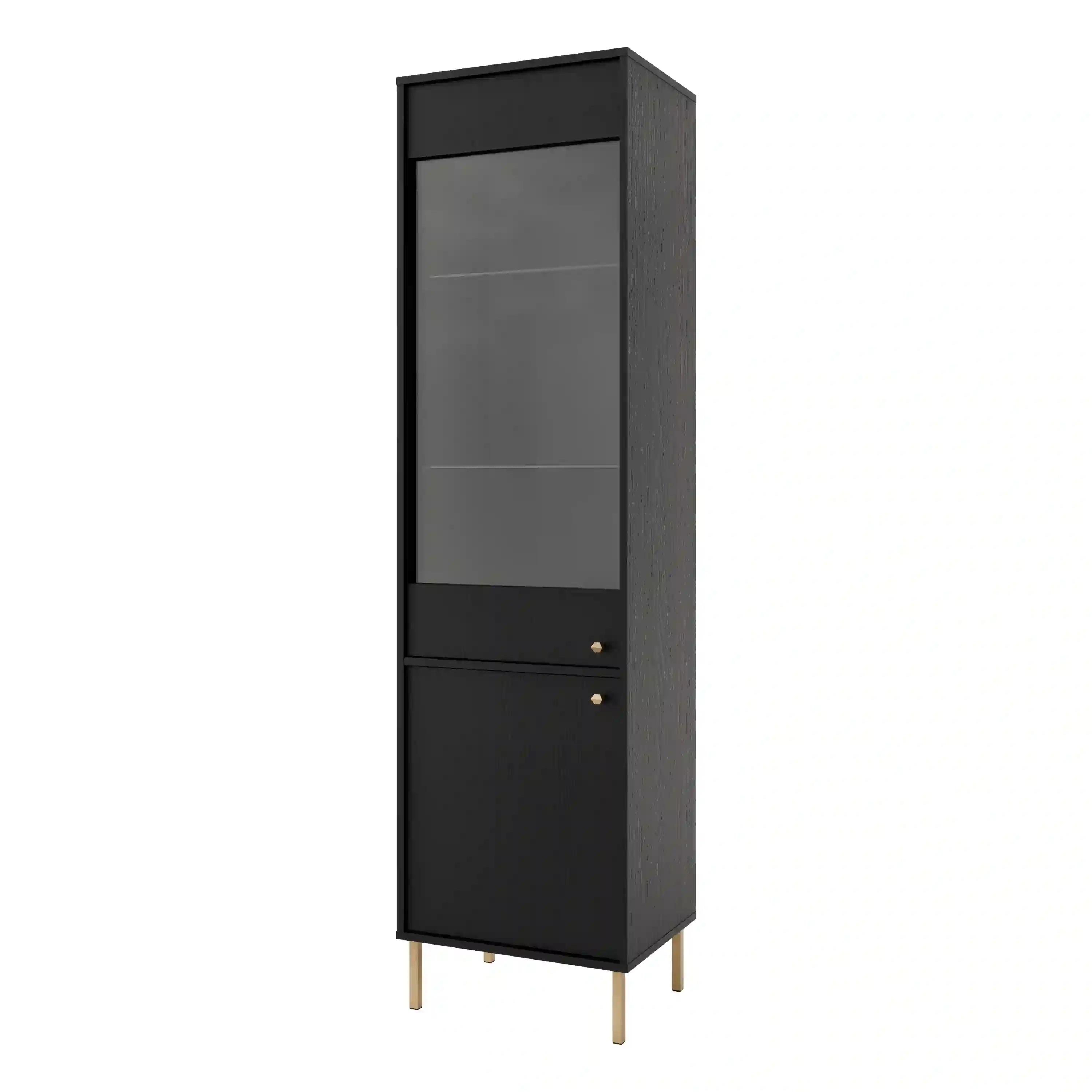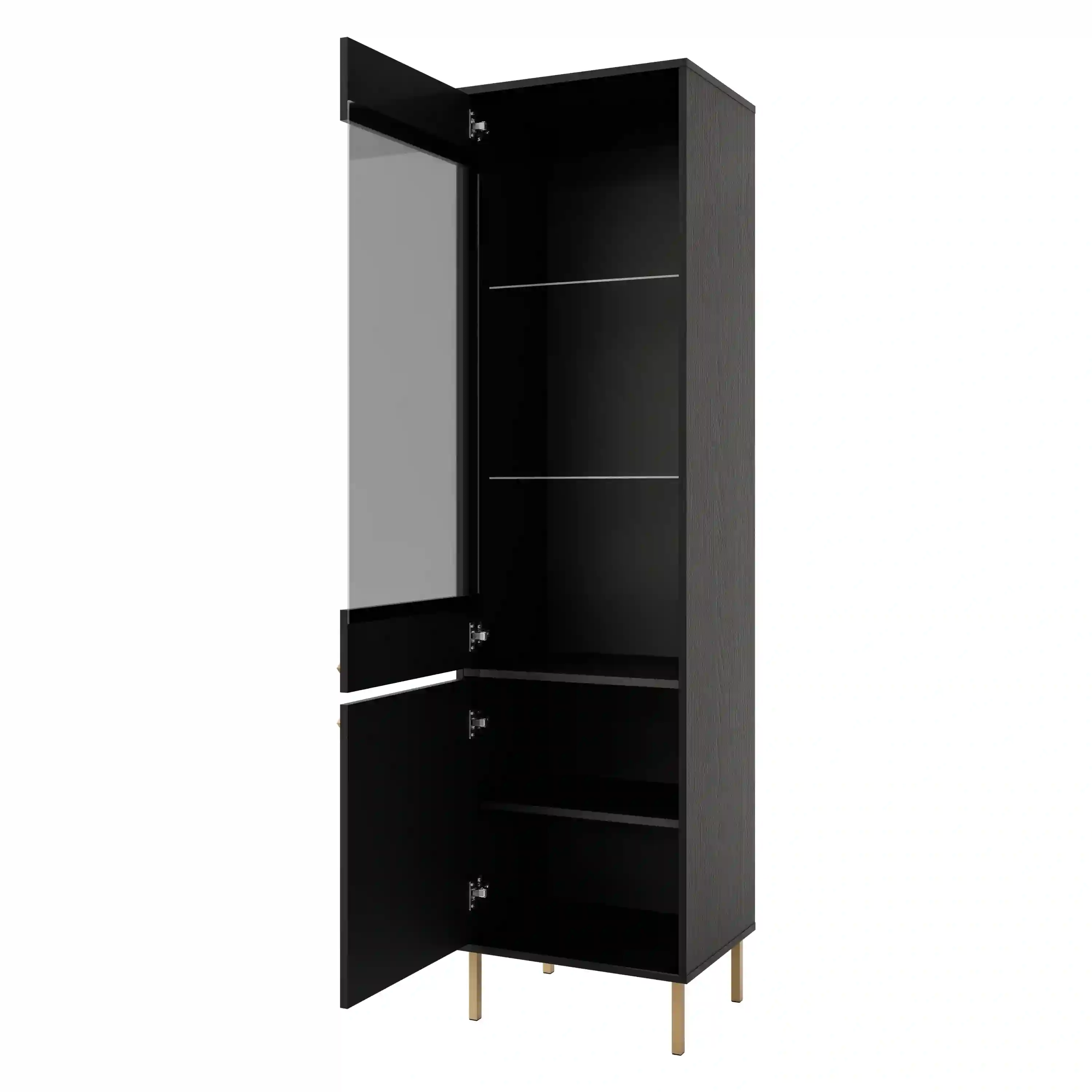 Witryna z kolekcji Sakai, wyposażona w dwoje drzwi - górne z hartowaną szybą antisol w kolorze grafitowym oraz dolne pełne drzwi. Wnętrze witryny zawiera trzy półki, w tym dwie wykonane ze szkła transparentnego o grubości 5 mm, które dodają lekkości i elegancji meblowi. Metalowe gałki w kolorze złotym podkreślają nowoczesny i stylowy charakter mebla. Idealna do salonu lub jadalni, gdzie łączy funkcjonalność z estetyką.