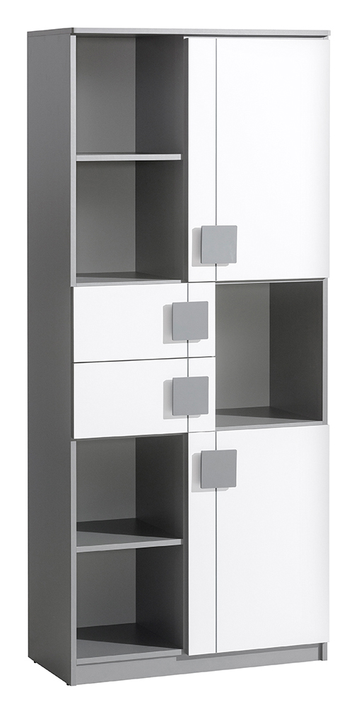 Elegancki i funkcjonalny regał półotwarty Gumi to idealne rozwiązanie do pokoju dziecka. Dobrze przemyślany układ z dwiema szufladami i wieloma półkami zapewnia dużo miejsca na przechowywanie. Wykonany z trwałej płyty laminowanej w kolorze białym i antracytowym, doskonale współgra z nowoczesnym stylem wnętrza. Drzwi uchylne ułatwiają dostęp, a solidne wykonanie gwarantuje długą użytkowanie. Ten regał to nie tylko praktyczne rozwiązanie, ale także designerski element, który doda charakteru każdemu dziecięcemu pokoikowi.