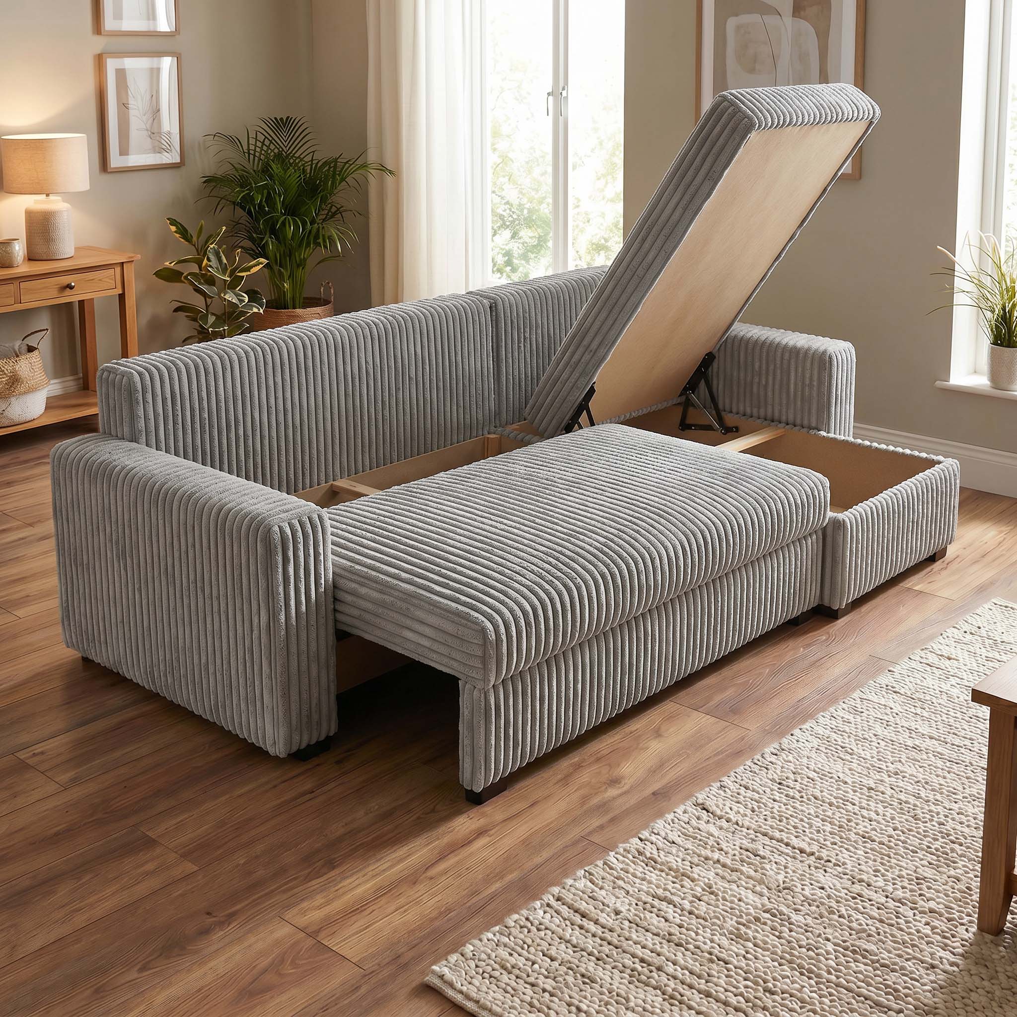 - ✅ Funkcja spania, dzięki której narożnik zmienisz w pełnowymiarowe, dwuosobowe łóżko w zaledwie kilka chwil