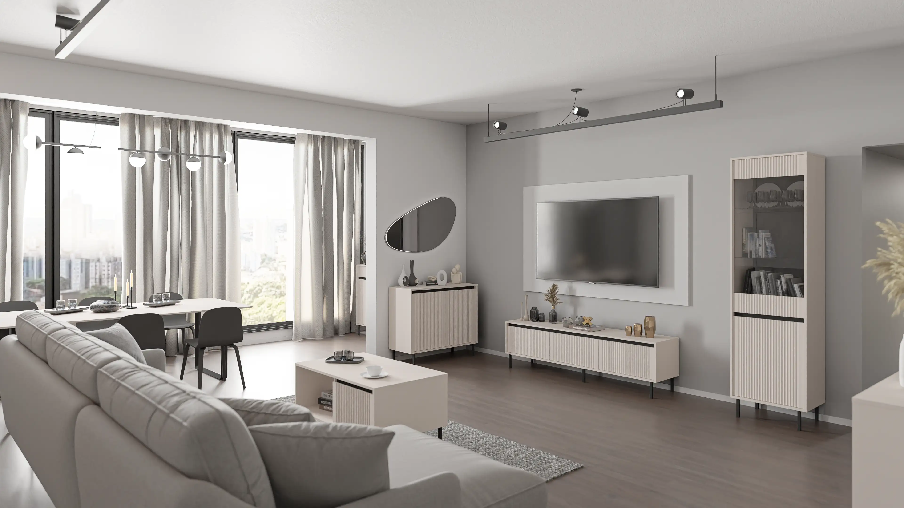 Kolekcja Yukashi to połączenie subtelnej elegancji i funkcjonalnego minimalizmu, inspirowane japońską estetyką. Pionowe ryflowanie frontów, dostępnych w kolorze jasnego beżu lub dębu evoke, dodaje meblom subtelnej elegancji i wizualnej lekkości, a czarne detale oraz wysokie, smukłe nóżki dodają całości nowoczesnego charakteru. Meble Yukashi doskonale sprawdzą się zarówno w salonie, jak i w przedpokoju, sypialni czy gabinecie – ich modularna forma i uniwersalna kolorystyka dają wiele możliwości aranżacyjnych.