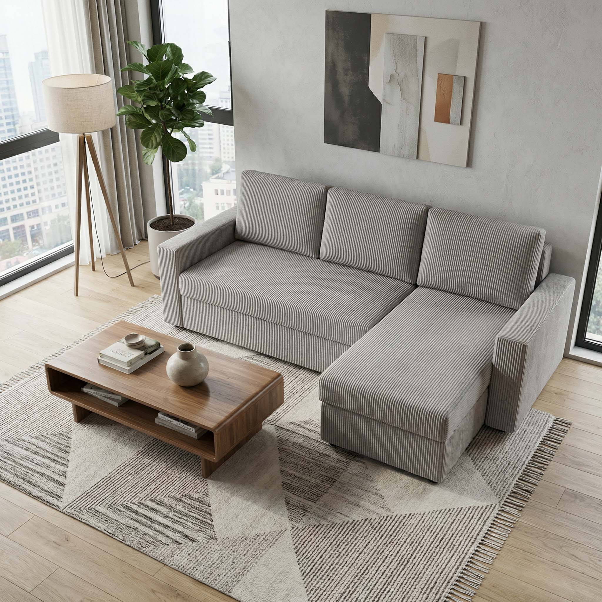 - ✅ Luksusowa tkanina sztruksowa – przyjemna w dotyku, trwała i ponadczasowo stylowa, podkreślająca elegancki charakter narożnika