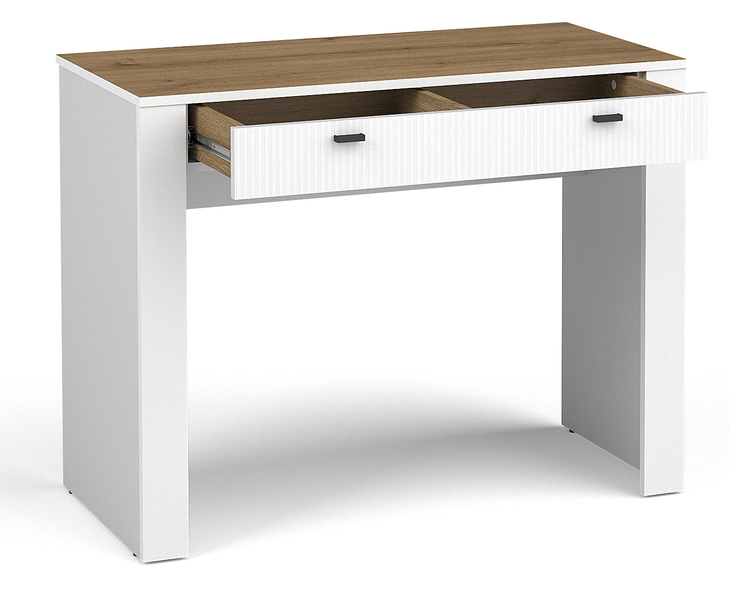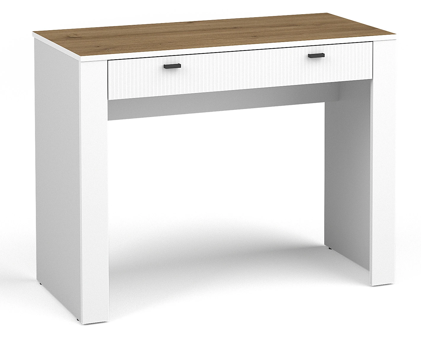 Wyjątkowa toaletka do garderoby Mossa MO10 to niezbędny element każdej nowoczesnej sypialni. Jej minimalistyczny design w połączeniu z funkcjonalnością sprawią, że dbanie o porządek stanie się prawdziwą przyjemnością. Zaprojektowana z myślą o praktycznym wykorzystaniu przestrzeni, posiada szufladę oraz półkę, zapewniając miejsce na kosmetyki, biżuterię czy akcesoria. Klasyczne połączenie bieli z dębem whisky nadaje meblowi elegancji, a matowe wykończenie dodaje mu nowoczesnego charakteru. Odkryj teraz funkcjonalność i piękno w jednym!